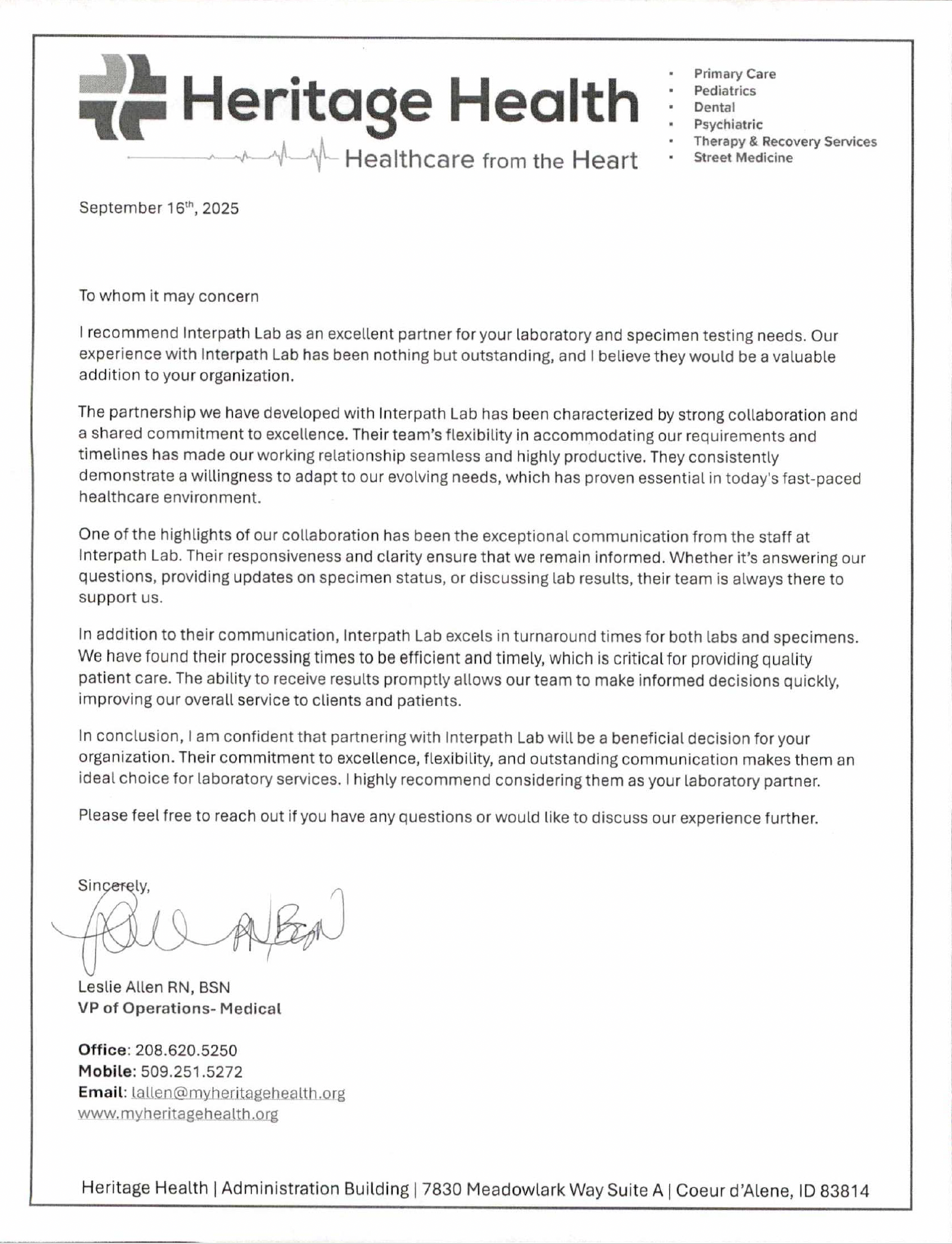 We are proud to say we are loyal lnterpath customers-and fans-for life. Thank you, lnterpath, for standing by us and for being a true partner in our mission to care for our communities.
